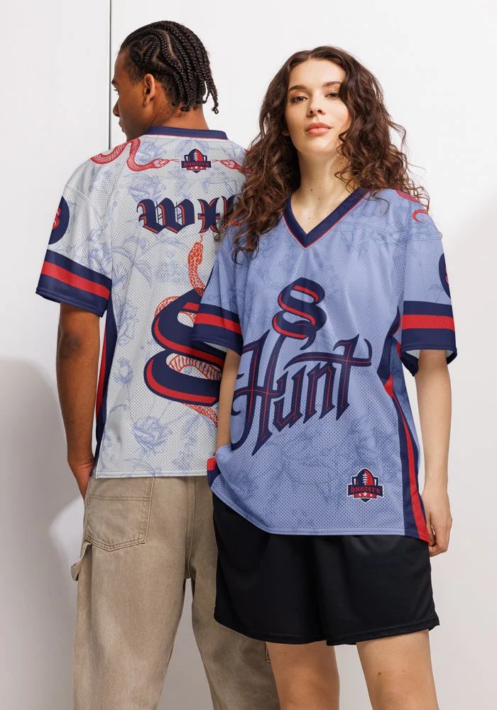 Stand out on and off the field with a custom all-over print American football jersey featuring your design, name, number, or logo. Made for comfort, performance, and bold style.